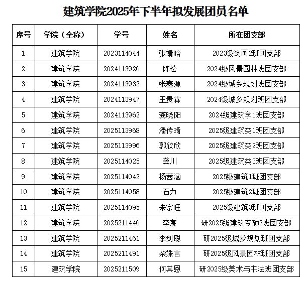 培养考察、二级团组织审核团支部推荐意见和相关材料,拟推荐张靖晗等15名同学为本次发展团员对象,具体名单见下表。
