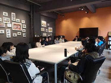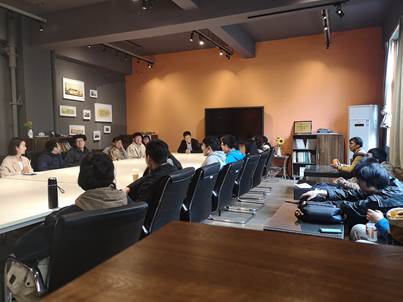 的冯裕茗,与同学交流分享学习方向与要点的问题,到会的有班导师付飞老师,辅导员奉天老师,冯裕茗以及建筑学三班全体同学。