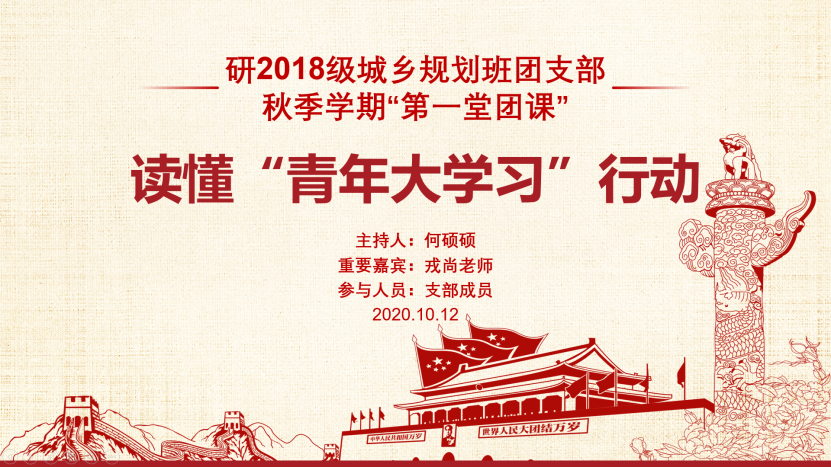 研2018级城乡规划班团支部在线上开展了以“读懂‘青年大学习’行动”为主题的“秋季第一堂团课”活动,由团支部书记何硕硕同志主持,辅导员戎尚老师参与本次团课。